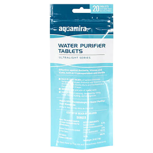 Lightweight but powerful, Aquamira Water Purifier Tablets provide all the benefits of our popular liquid chlorine dioxide formula in an easy to use solid format. Each tablet purifies one liter (32 oz.) of water and is conveniently sealed in an individual child resistant foil pouch. The individual tablet pouches are stored inside our re-sealable storage pouch that eliminates packaging waste and can be packed away almost anywhere. To use, simply drop one tablet into one liter of water and wait the required time.