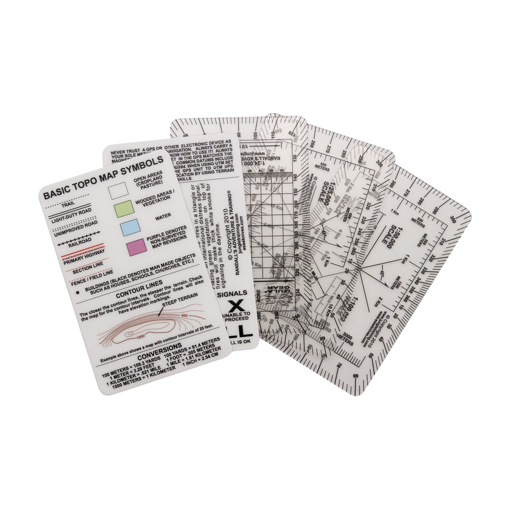 A must-have for anyone using a GPS, map and compass. Contains 3 clear cards with 1:24,000, 1:25,000, 1:50,000, 1:100,000, and 1:250,000 map scales. Also includes two white cards with survival tips, signaling tips, instructions on how to read a topo map, how to adjust for declination, how to determine distance traveled, how to use UTM with your GPS and compass, and how to travel an azimuth. Printed on 30 Mil plastic credit card stock.