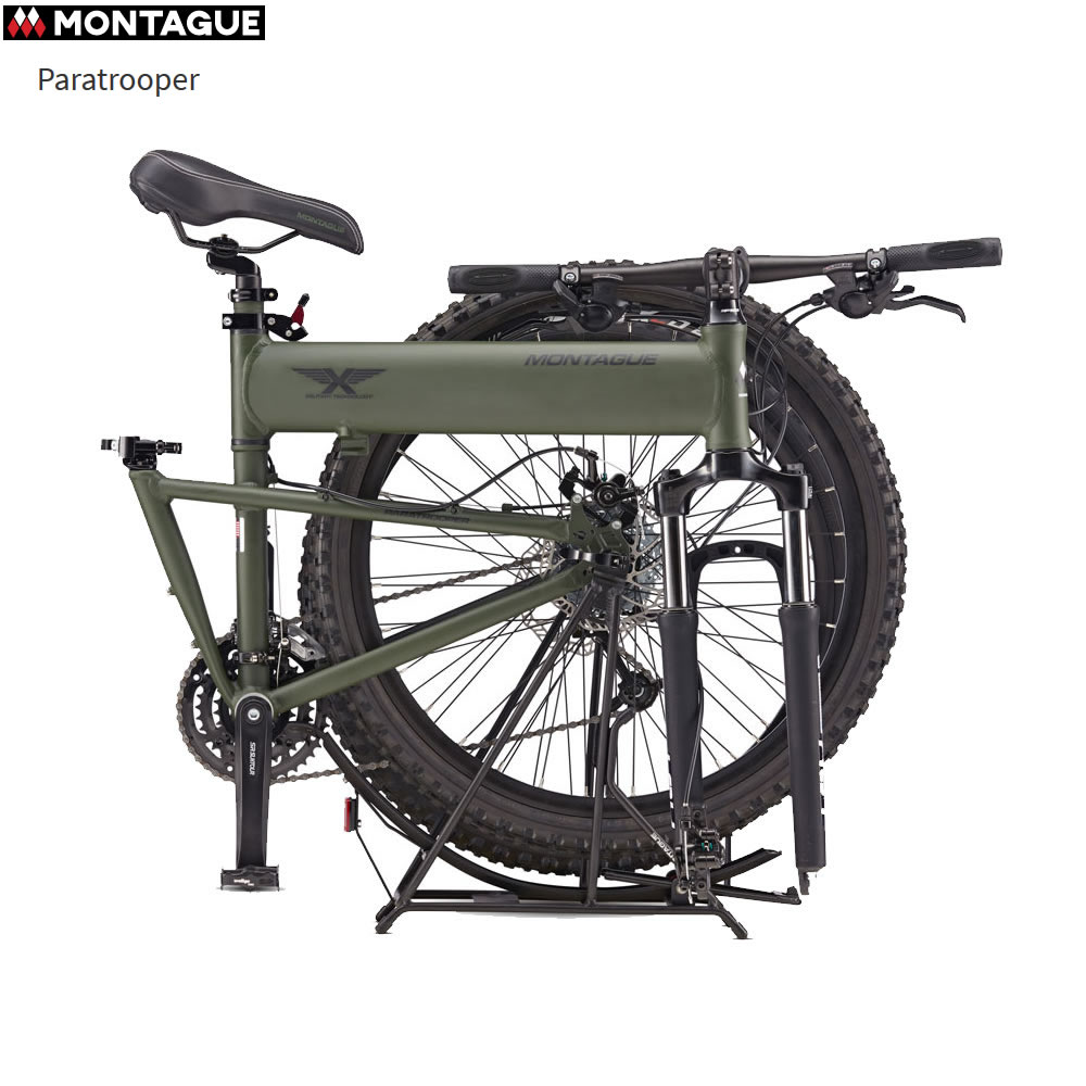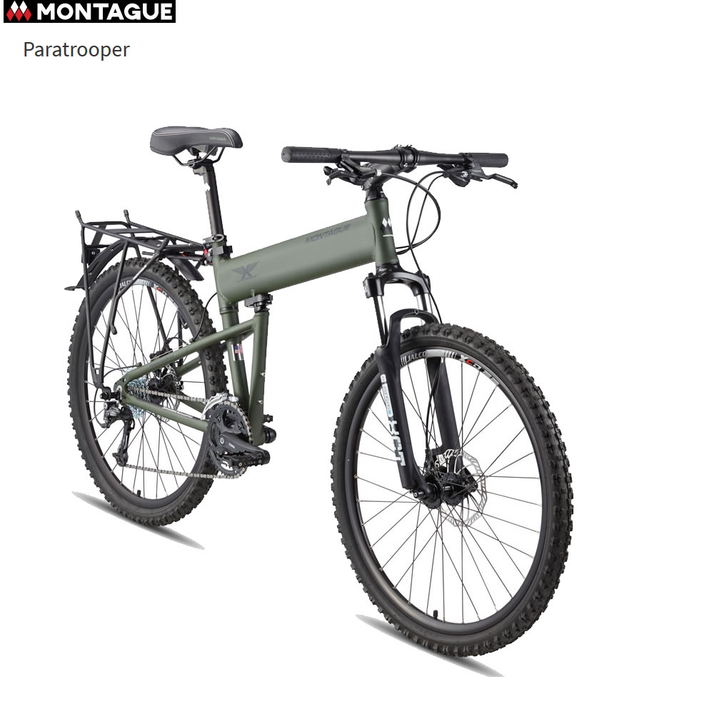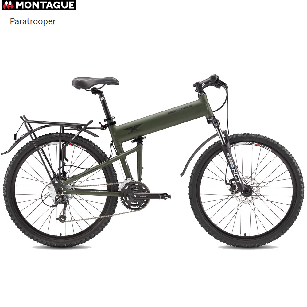 The classic folding mountain bike from Montague; the Paratrooper is tough, rugged, and ready for anything. Its patented folding design was developed under a grant from DARPA to allow airborne soldiers to drop out of airplanes and into combat.