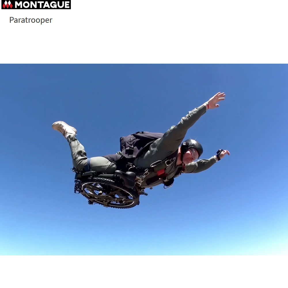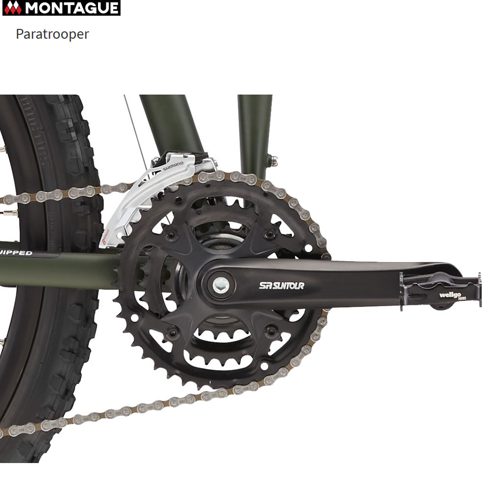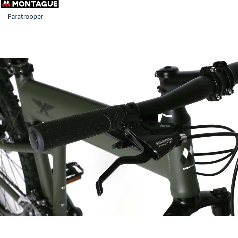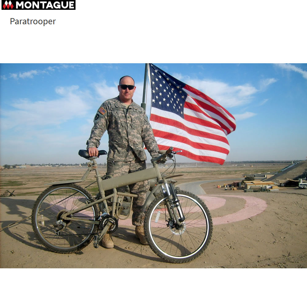 The classic folding mountain bike from Montague; the Paratrooper is tough, rugged, and ready for anything. Its patented folding design was developed under a grant from DARPA to allow airborne soldiers to drop out of airplanes and into combat.