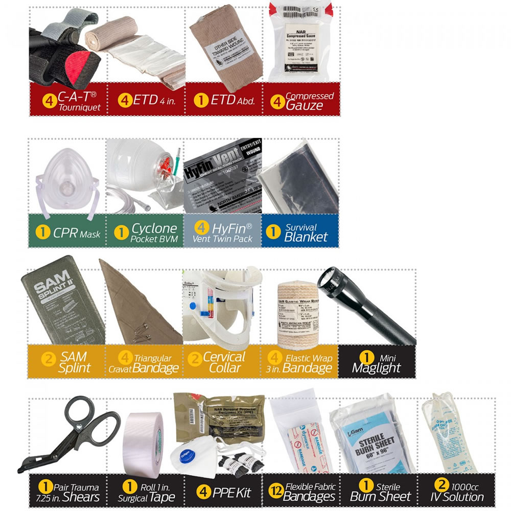 Featuring 6 hook-and-loop internal pouches in various sizes which can be self-labeled for the specific mission set; 4 smaller pouches for hemorrhage control products and 2 larger ones to accommodate airway & intravenous products CONTENTS: