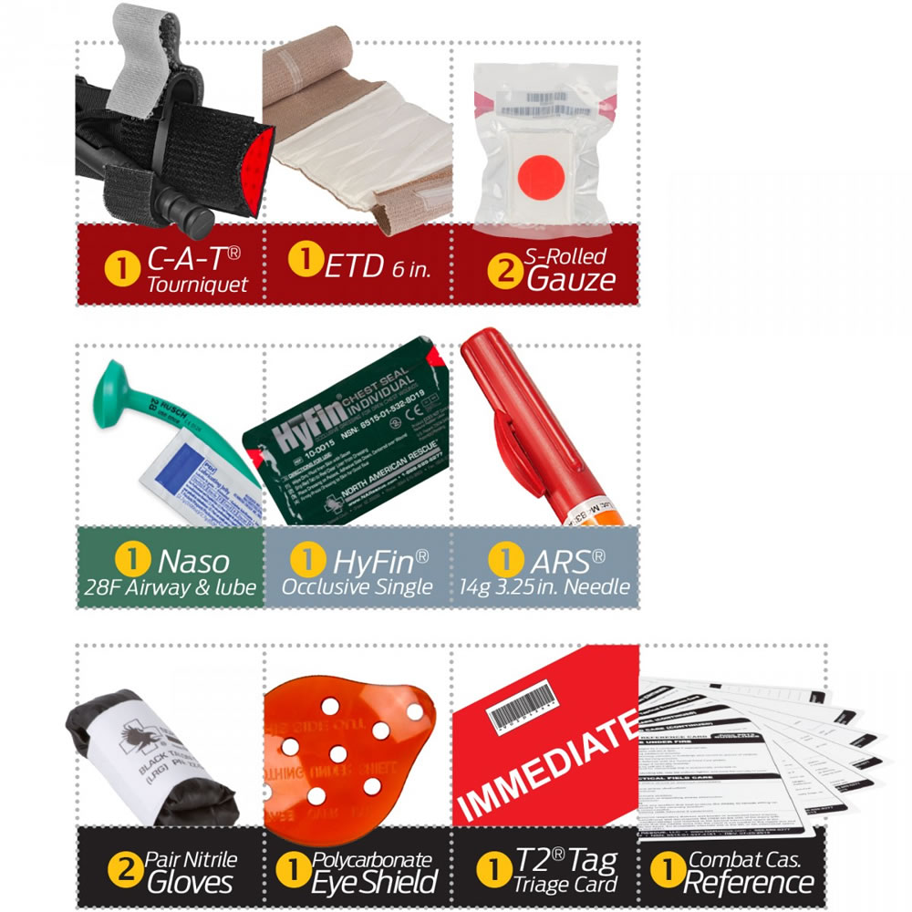The Individual Kit from North American Rescue has been designed for the Warfighter/Operator and packed to provide all of the tools to mitigate the three leading causes of preventable combat death (60% extremity bleeding / 33% tension pneumothorax / 6% airway obstruction) . Our modular system can be attached to the operator using the split-tale connector, PALS/MOLLE style webbing or by fastening to the web/ gun belt using the quick weave method. Belt and leg attachment straps can be removed and reattached as needed to allow maximum flexibility during load carriage configuration.