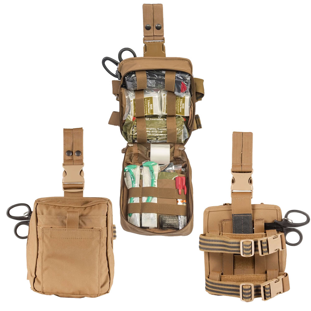 Combat Casualty Response Kit®—Medic/Leg Rig™. The container is constructed of 500D CORDURA® Solution-Dyed Nylon with Near Infrared Signature Reduction, Ghillie-Tex IR signature reduction hardware and silent, self repairing nylon zippers with 550 pull cords. The kit can be employed in three ways (1) using the split-tale connector with height adjustment and Quick-Grip™ leg straps (2) PALS/MOLLE style webbing for attachment to the aidbag/ backpack or (3) fasten to the web/gun belt using the quick weave method. Belt and leg attachment straps can be removed and reattached as needed to allow maximum flexibility during load carriage configuration.