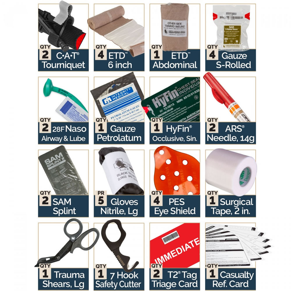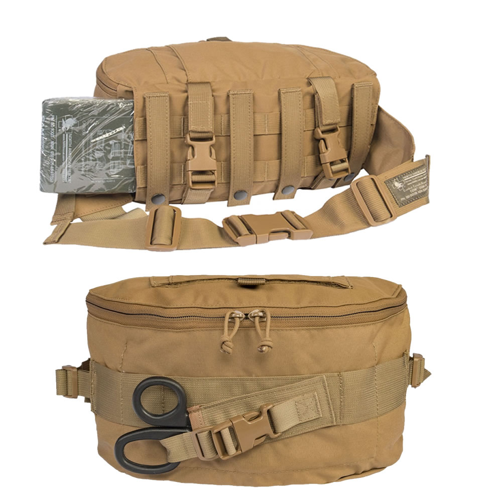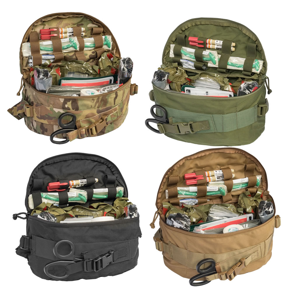 Combat Casualty Response Kit®-Squad Kit™ capitalizes on durability, versatility, mobility, and efficiency. The kit’s medical supplies are carefully selected to address the top three causes of death from penetrating trauma as identified by the COTCCC (60% extremity bleeding / 33% tension pneumothorax / 6% airway obstruction). Multiple-load carriage configuration capabilities include fanny pack, over the shoulder, attachments for 3-day assault packs and MOLLE style webbing.