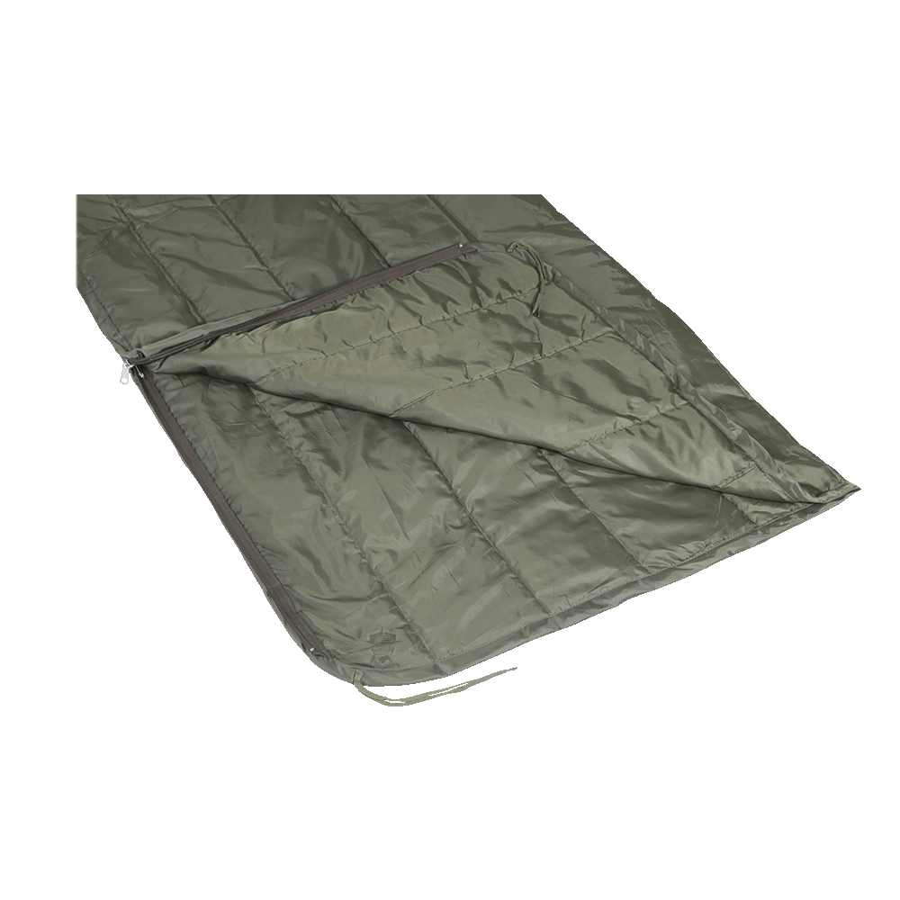 Two-way nylon zipper gives the option of using as a sleeping bag or leaving the bottom open, forming a “tube”, useful when wearing boots or sitting around in the cold