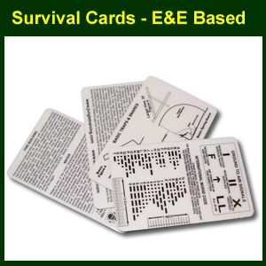 From the folks at ESEE / Izula. Printed on 30 mil plastic credit card stock. Four white cards with survival tips, signaling tips, Morse code, trap and snare diagrams, fire building tips, navigation tips, Escape and Evasion tips and much more. Pretty handy stuff to keep in your kit, your emergency supplies or go bag in case you need it! The focus is on escaping and evading (E&E), and so most pertinent to military members or tactical professionals operating in less than friendly territory. And hey, when you read and know all of the info they provide, you could cut ‘em up and even make decent fishing lures out of them.