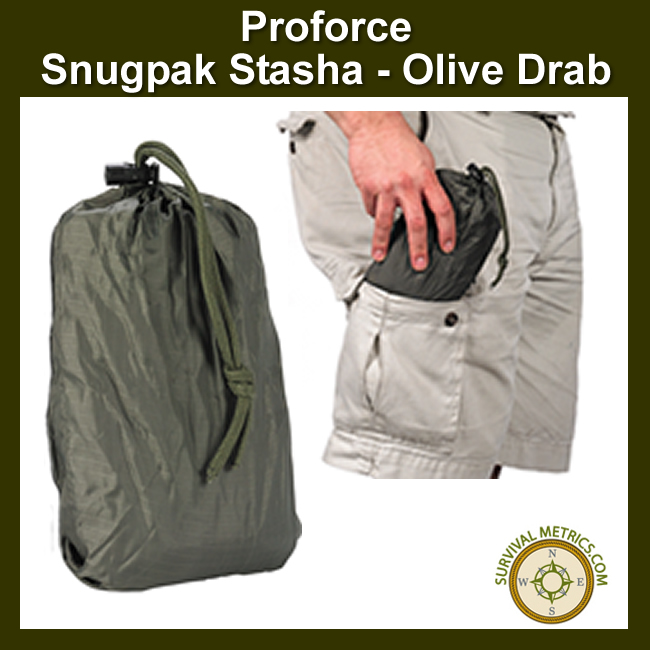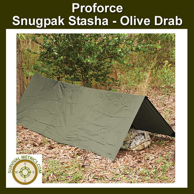 Stasha was made with newer lighter weight materials so as to achieve its impressive pack size. Because of its remarkable size it can be stashed away in a BDU cargo pants pocket, a backpack, a fanny pack, go bag and so on. It is simply stated an improved, simple, effective shelter that will aid in protection from the elements. It has looped webbing and grommets in each corner so it can be staked out or attached with guy ropes, which are provided. It comes with 4 guy ropes to allow it to be configured a number of ways. Down two opposite sides are plastic snaps which can allow it to be folded and snapped together to make an improvised bivvi. It can also be used as an impromptu emergency shelter should the need arise. For the prepared person who doesn't want to get caught out in the elements.
