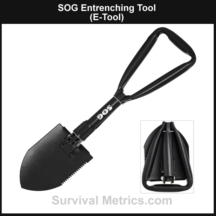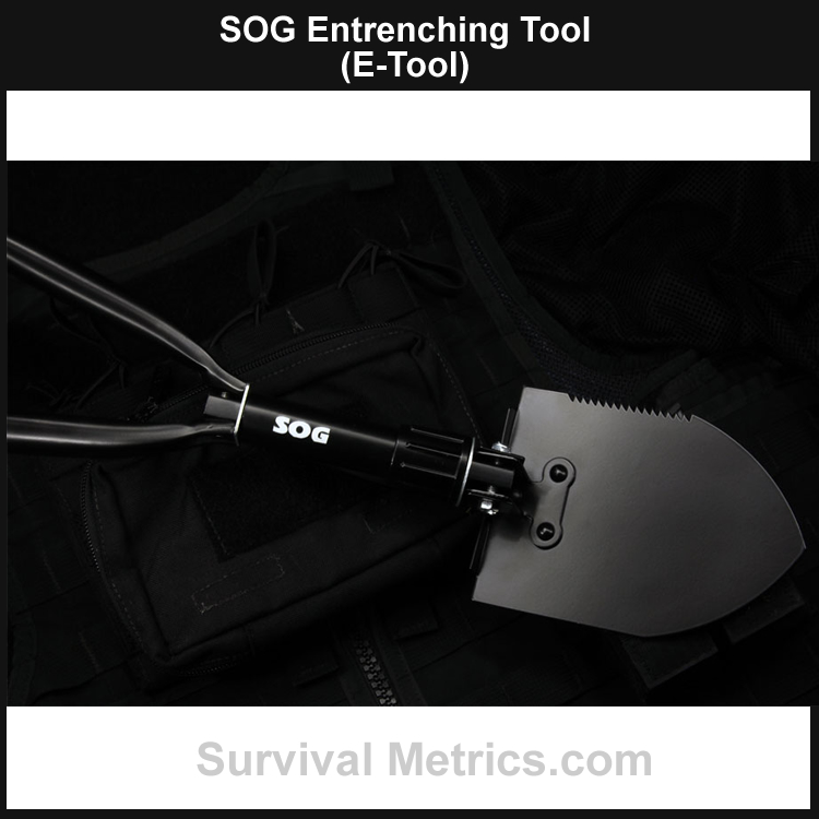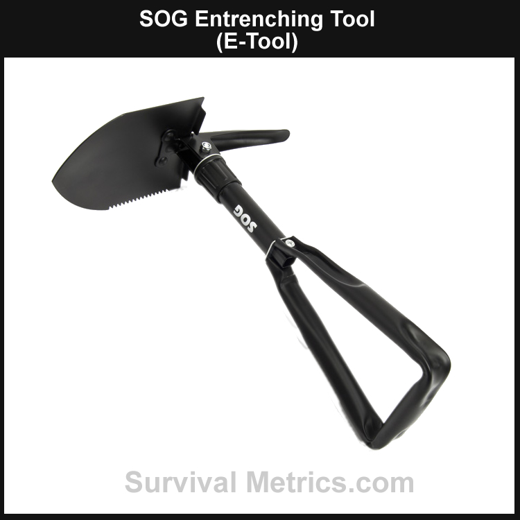 From SOG Specialty Knives and Tools. This Entrenching Tool (E-Tool) design provides rapid assembly to enable the digging of holes, pits, etc., as well as providing a pick function for other tasks. Comes with a black nylon belt sheath. Used by militaries around the world, the E-Tool is a vital piece of equipment for survival and emergencies.